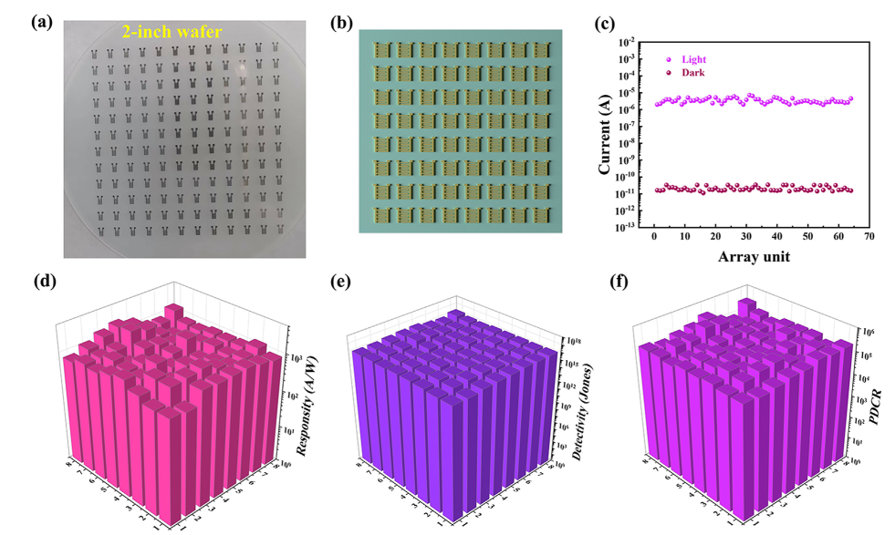 图3.基于2英寸氧化镓薄膜晶圆的8×8阵列器件及其主要性能柱状图。