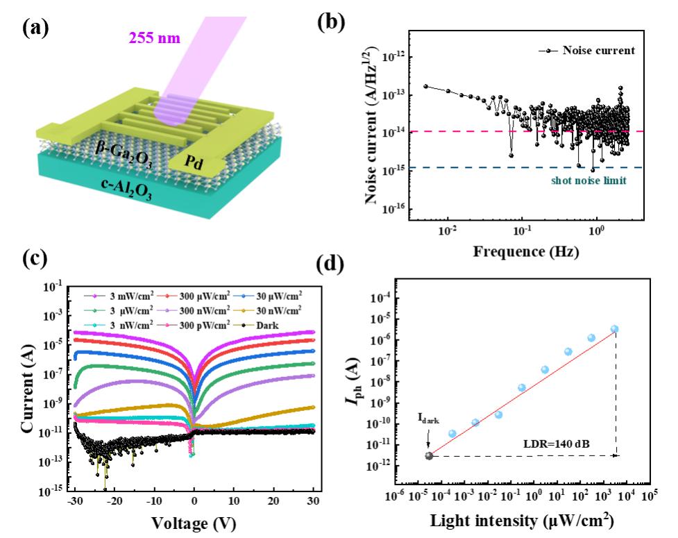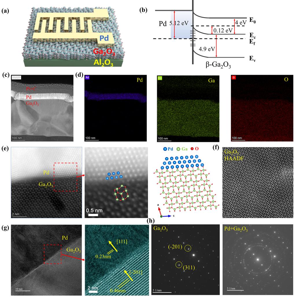 由于日盲紫外光(200~280nm)会被地球的臭氧层强烈吸收,所以在近地表没有日盲紫外成分,因此工作在该波段的光电探测器称为日盲紫外光电探测器。日盲紫外光电探测器因其“太阳光零干扰”特性,可精准探测火焰、电晕放电等微弱信号,在电力安全监测、火灾预警、环境监测、深紫外成像与通信等领域应用潜力巨大。作为一种超宽带隙半导体,氧化镓是一种极具潜力的日盲紫外探测材料。然而,氧化镓光电探测器的缓慢响应速度和较窄线性动态范围,阻碍了它们的商业应用。为解决这些问题,该团队创新采用高功函数金属钯(Pd)叉指电极,结合蓝宝石衬底外延生长的Ga₂O₃薄膜设计构筑了一种新型日盲紫外光电探测器。原子级透射电子显微镜数据表明,Pd-Ga₂O₃界面干净且平滑,由Ga₂O₃单晶和局部Pd单晶组成,有利于削弱费米能级钉扎效应(图1)。低损伤和低缺陷的接触界面提供了出色的光电响应时间(上升时间为2.4毫秒,下降时间为2.6毫秒)以及140分贝的超大线性动态范围(图2)。在2英寸的Ga₂O₃薄膜晶圆上制作了12×12阵列器件,其中所有64个(8×8)器件在测试中均保持了稳定的性能和高可靠性(图3)。基于该高性能日盲光电探测器,团队先后开发了智能火灾预警、紫外成像和保密通信等应用验证系统。